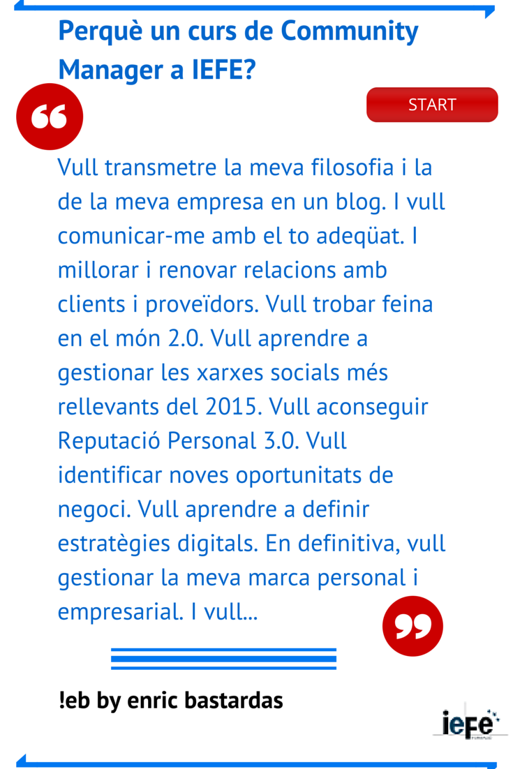 Però, per què fer un curs de Community Manager? Enric Bastardas (@Henry2095), un dels nostres formadors, i que impartirà el pròxim curs de Community Manager a IEFE, ens ho explica en aquesta breu infografia.